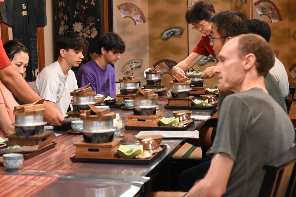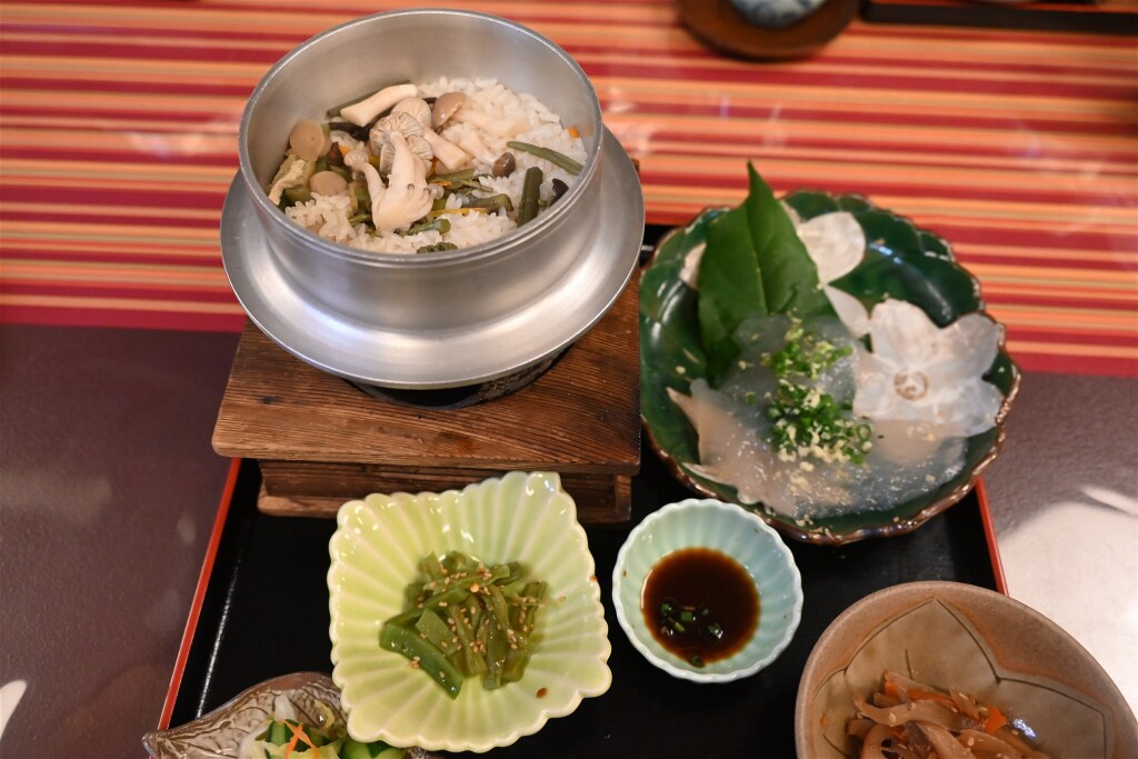 Please enjoy a delicious meal prepared by the Shinto priest’s family, featuring homemade konjac and kamameshi—traditional rice cooked in a small pot.)